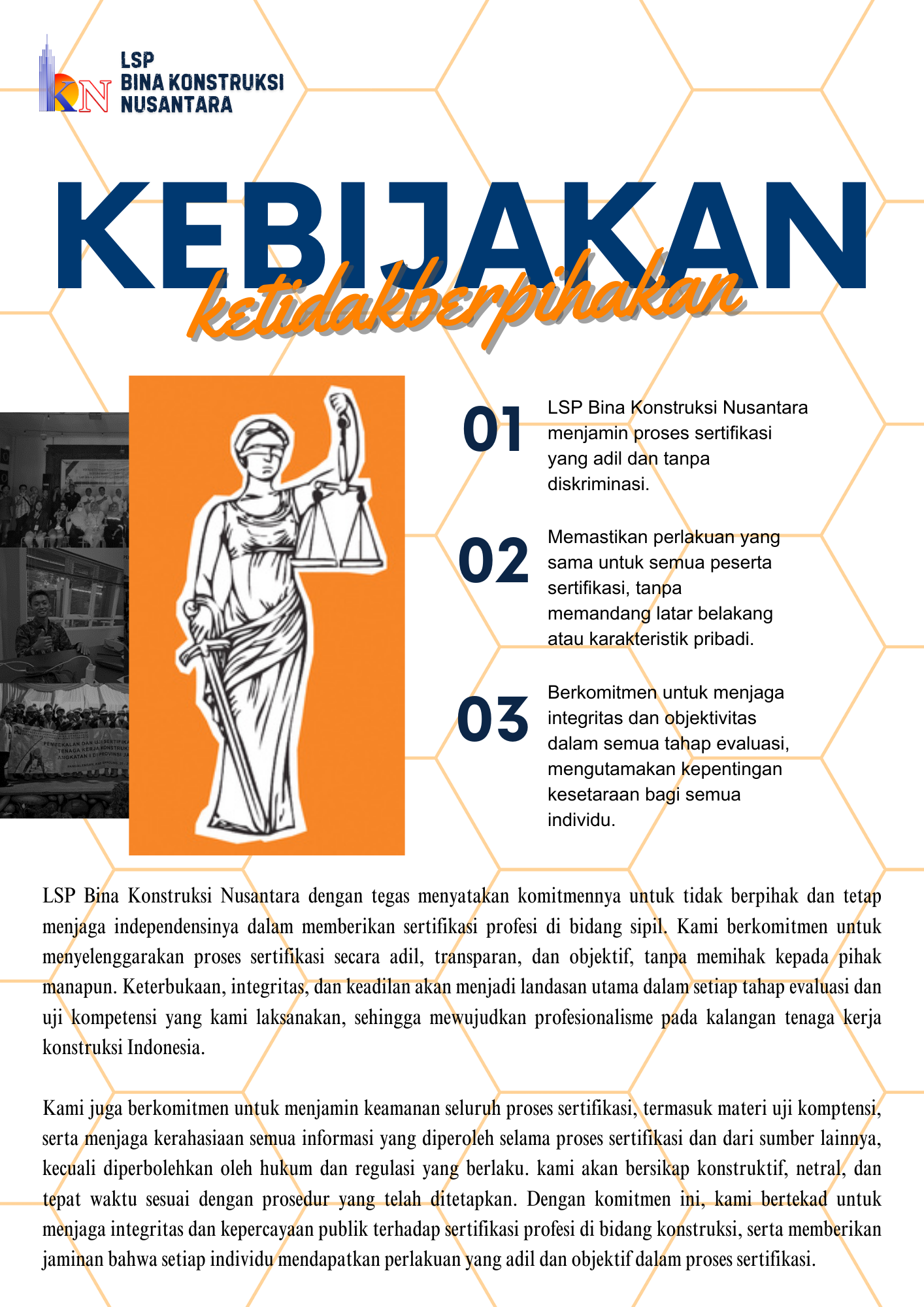 Lembaga kami berkomitmen penuh untuk menjaga ketidakberpihakan, independensi, dan objektivitas dalam seluruh proses sertifikasi kompetensi. Setiap kegiatan sertifikasi dilaksanakan secara profesional tanpa adanya tekanan komersial, finansial, maupun kepentingan pribadi yang dapat memengaruhi hasil keputusan sertifikasi.